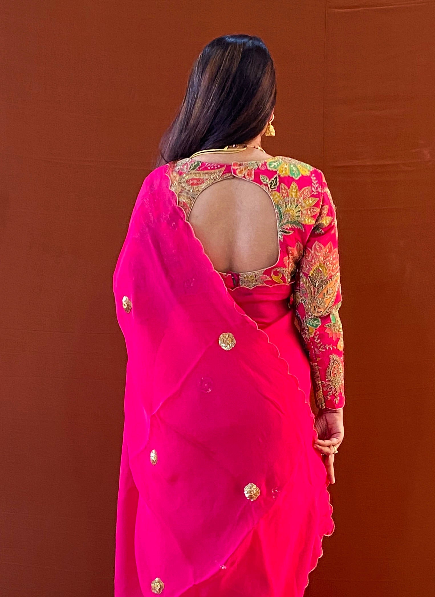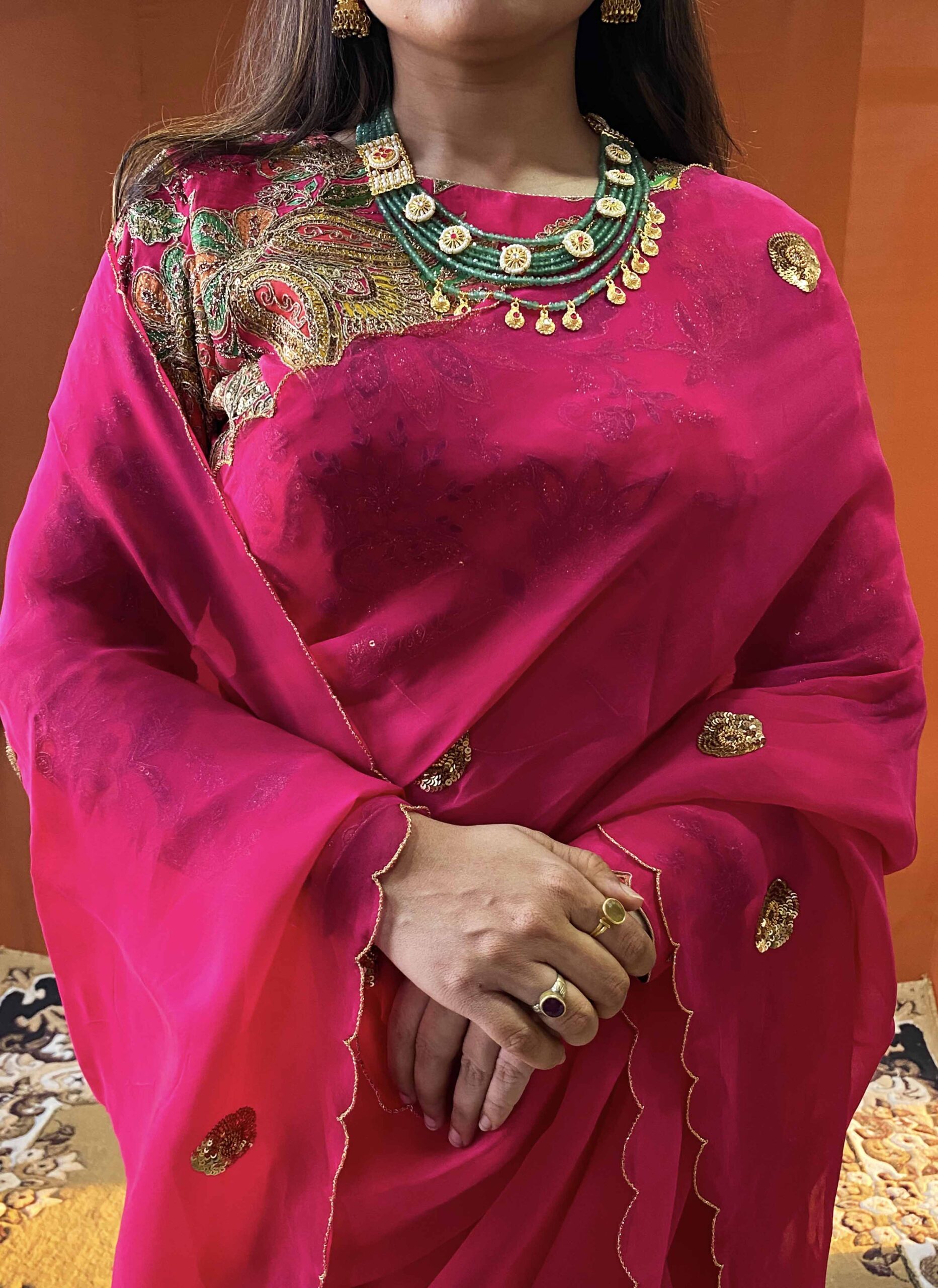husn pink handwork viscose organza saree with floral blouseHusn – Pink Handwork Viscose Organza Saree with Floral Blouse