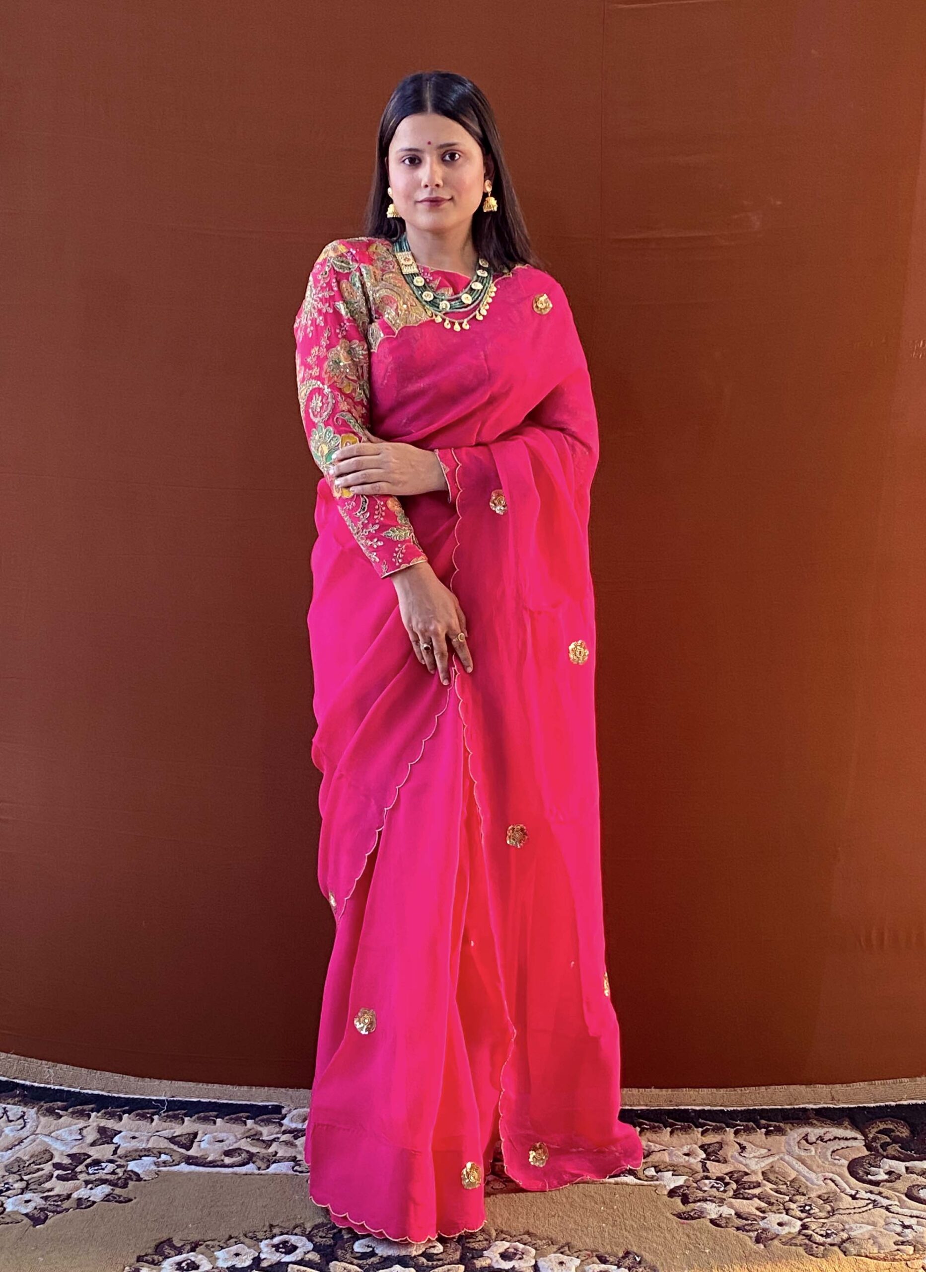 Husn – Pink Handwork Viscose Organza Saree with Floral Blouse