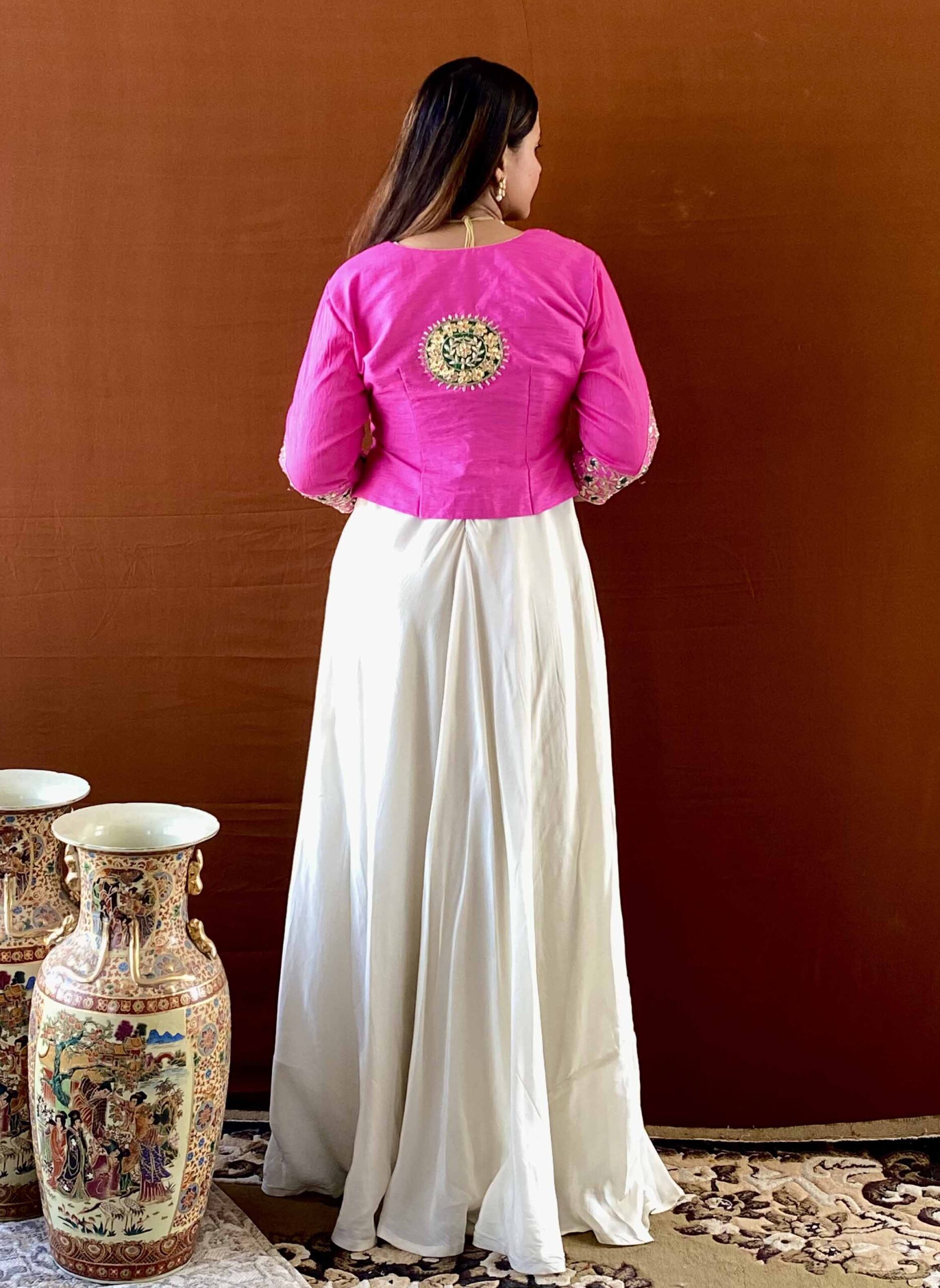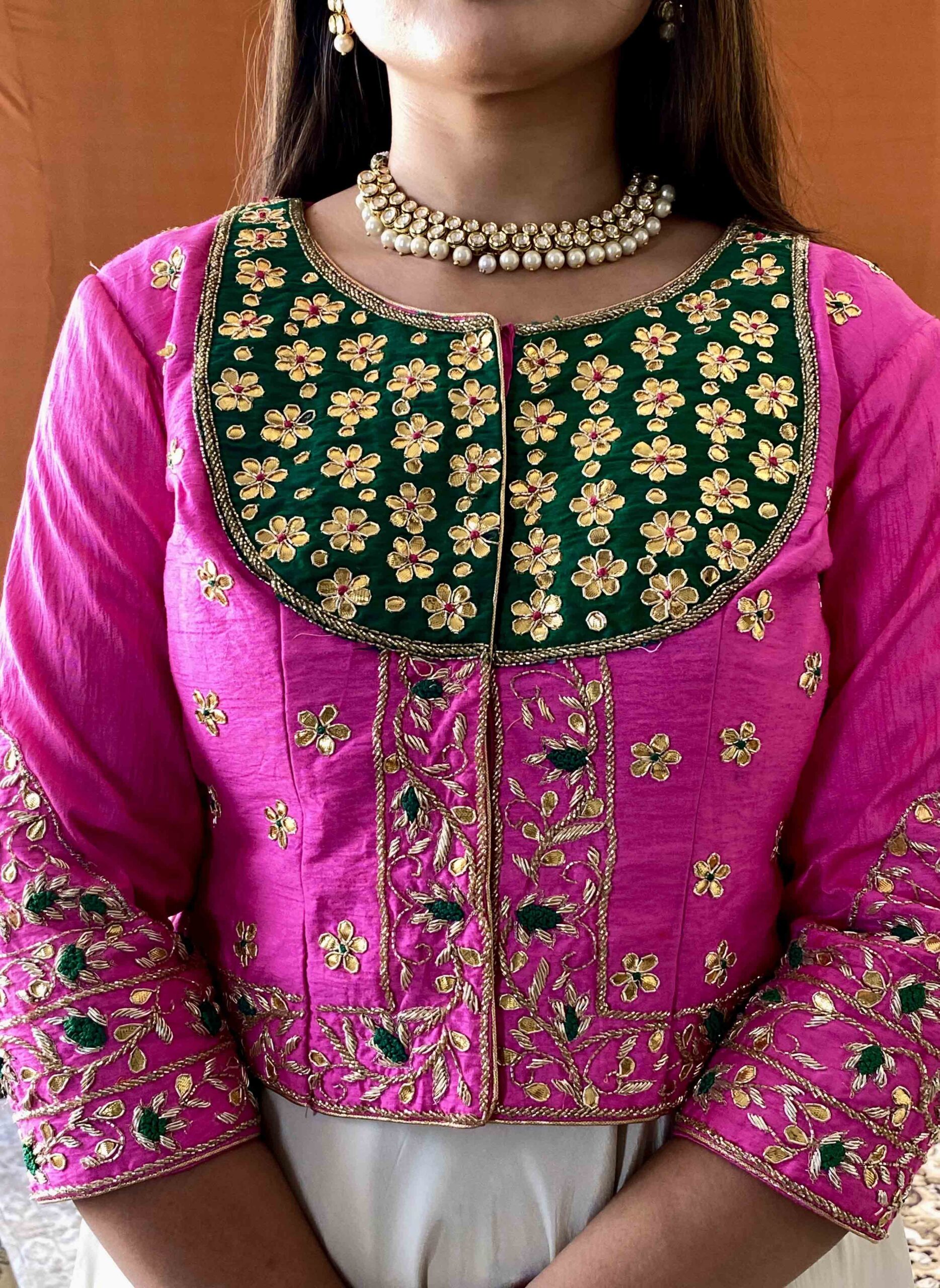 The Pink Handwork Gota Patti Blouse by Anvi Ethnics is a timeless keepsake for every festive wardrobe. With its intricate detailing and luxurious silk base, this ethnic short jacket for women defines elegance, tradition, and artistry in every stitch.