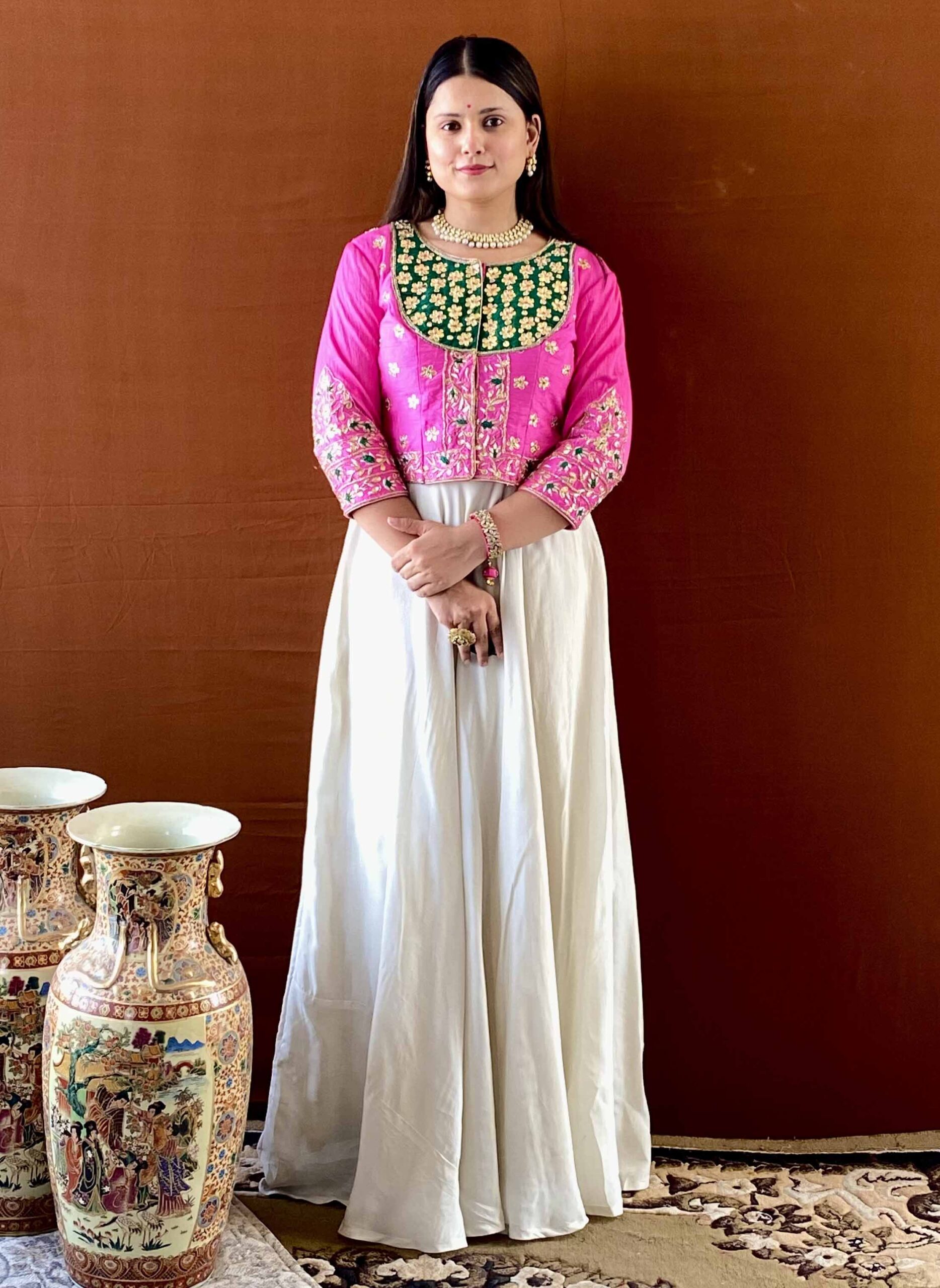 For a modern spin, wear it as a statement handwork blouse over a plain gown or palazzo set. Accessorize with jhumkas or kundan jewelry to complete your festive ensemble.