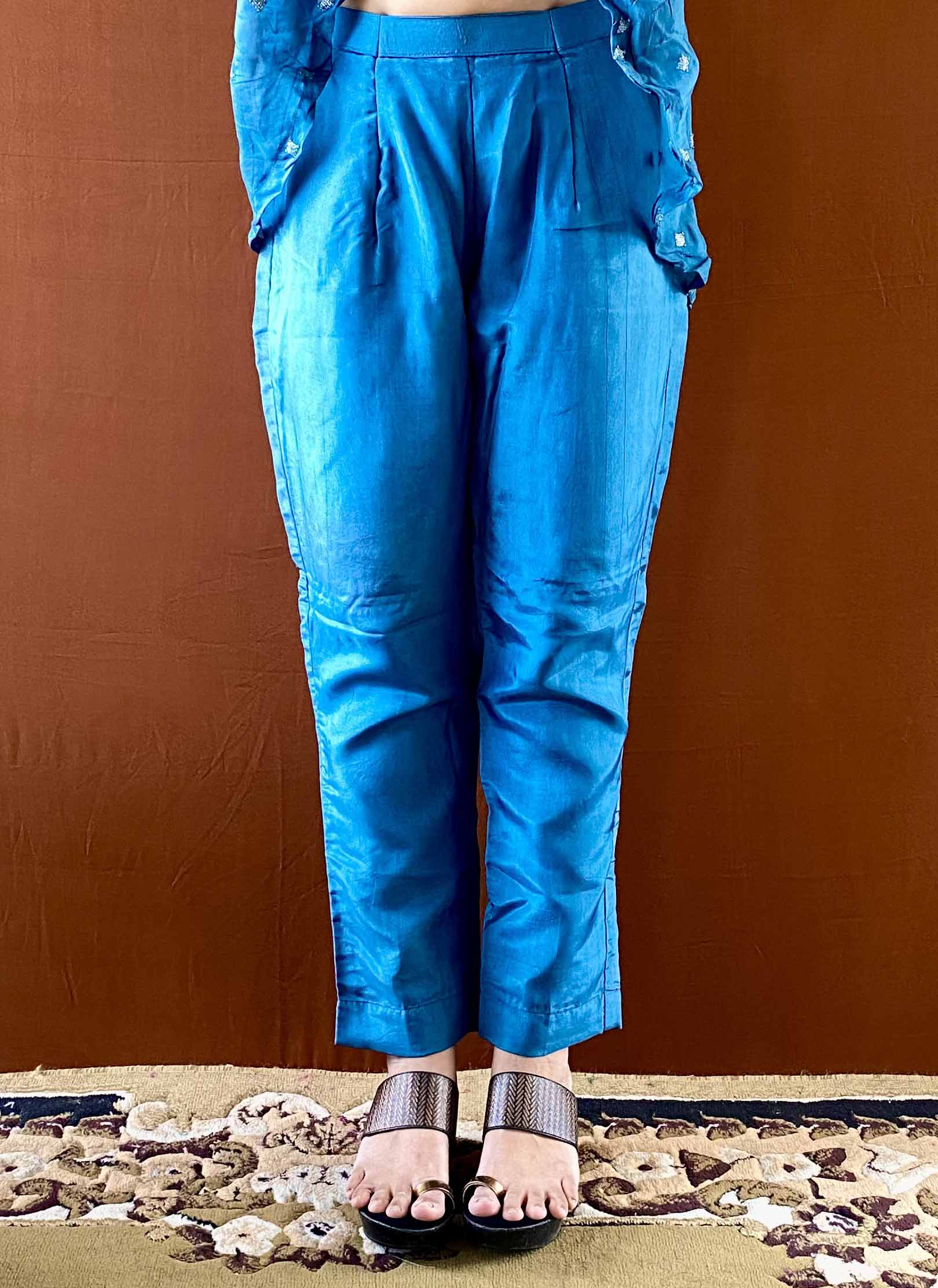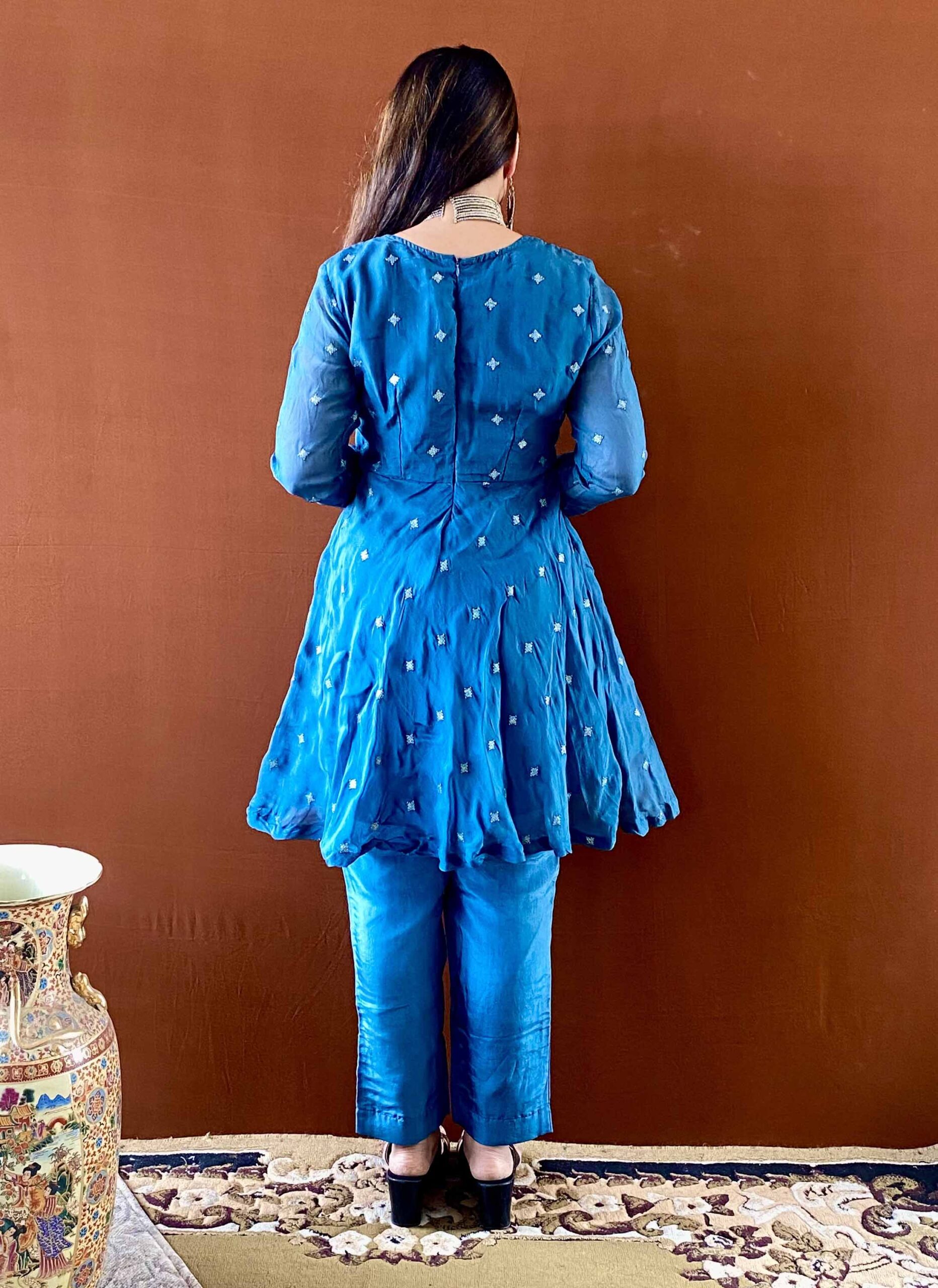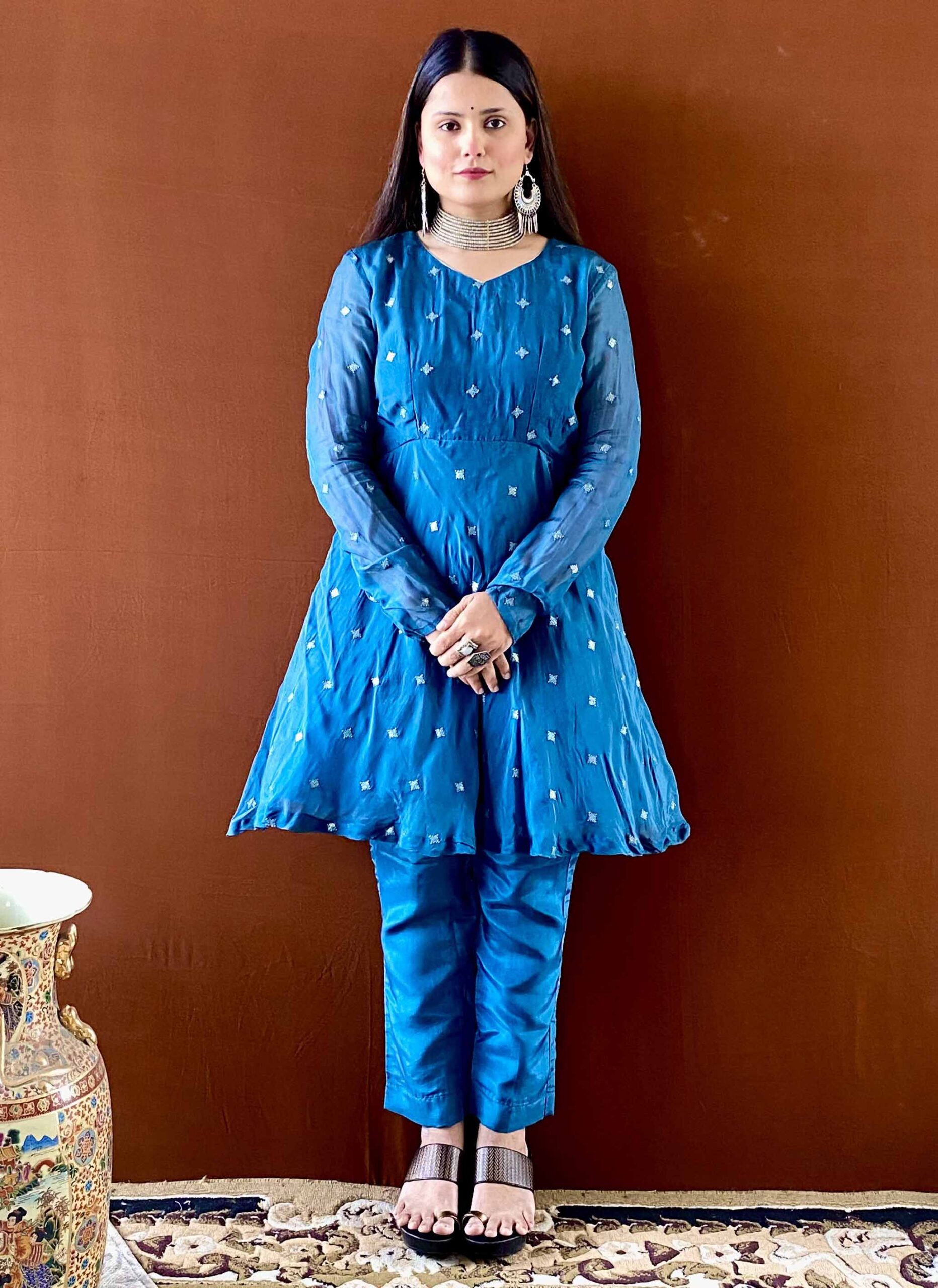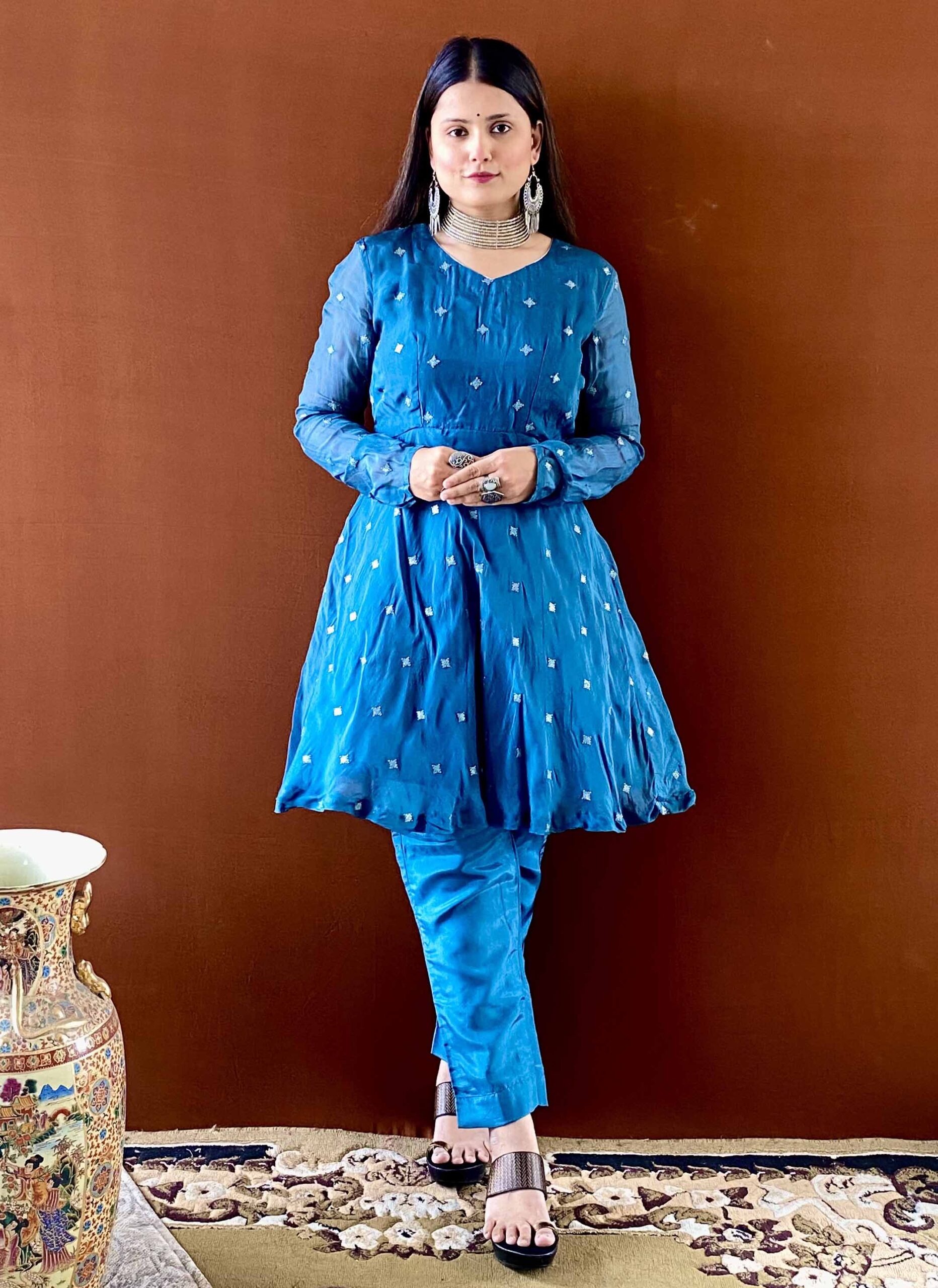 This Blue Anarkali Suit Set for Women by Anvi Ethnics is designed for festive occasions where tradition meets subtle sophistication. The A-line Anarkali top features an above-knee length and a graceful V-neckline, crafted in Georgette Organza with delicate self-butis that catch the light just right. Paired with a structured straight-fit Upada silk cigar pant that includes a practical pocket, this set offers style and comfort for long celebratory hours.