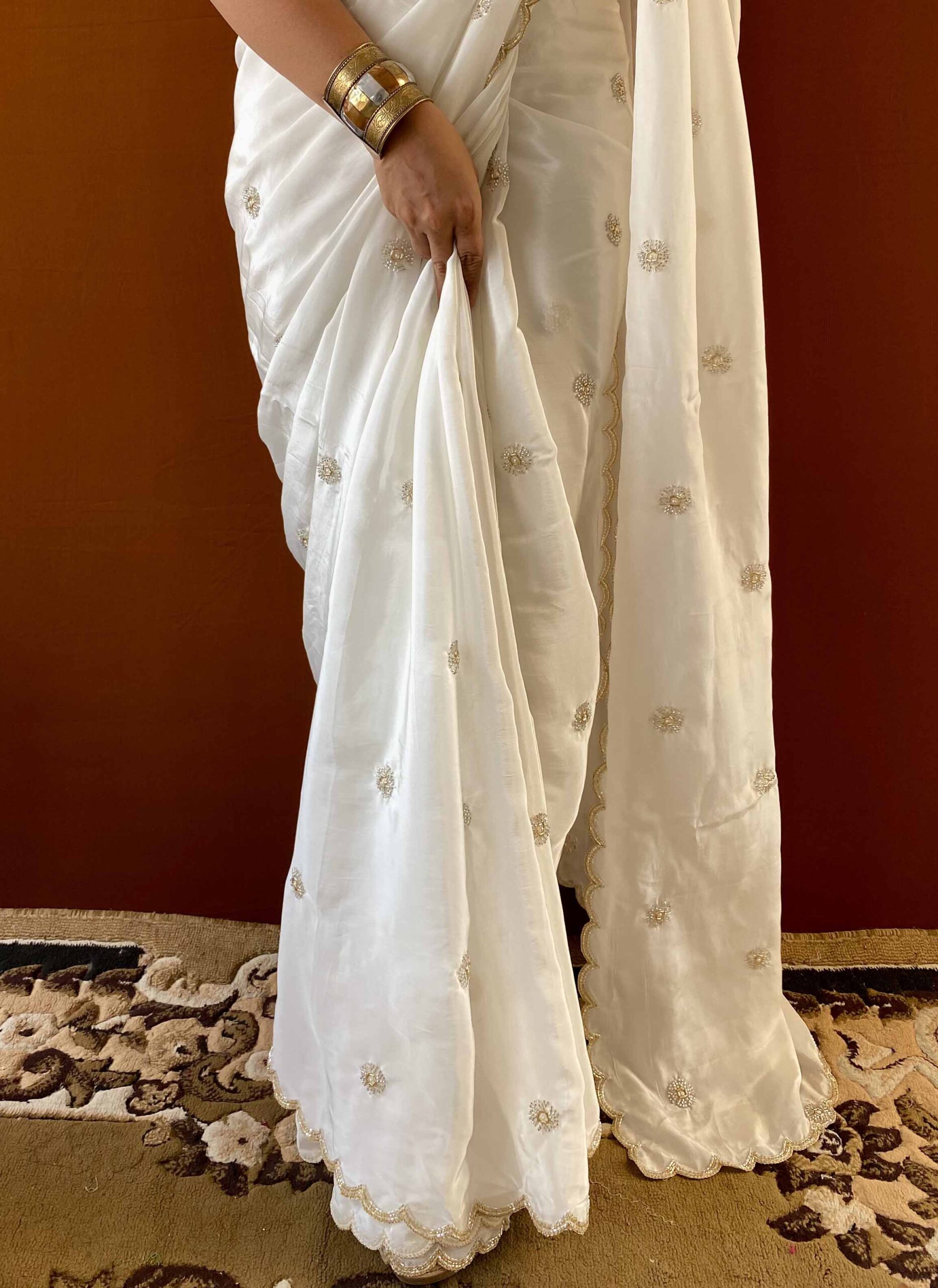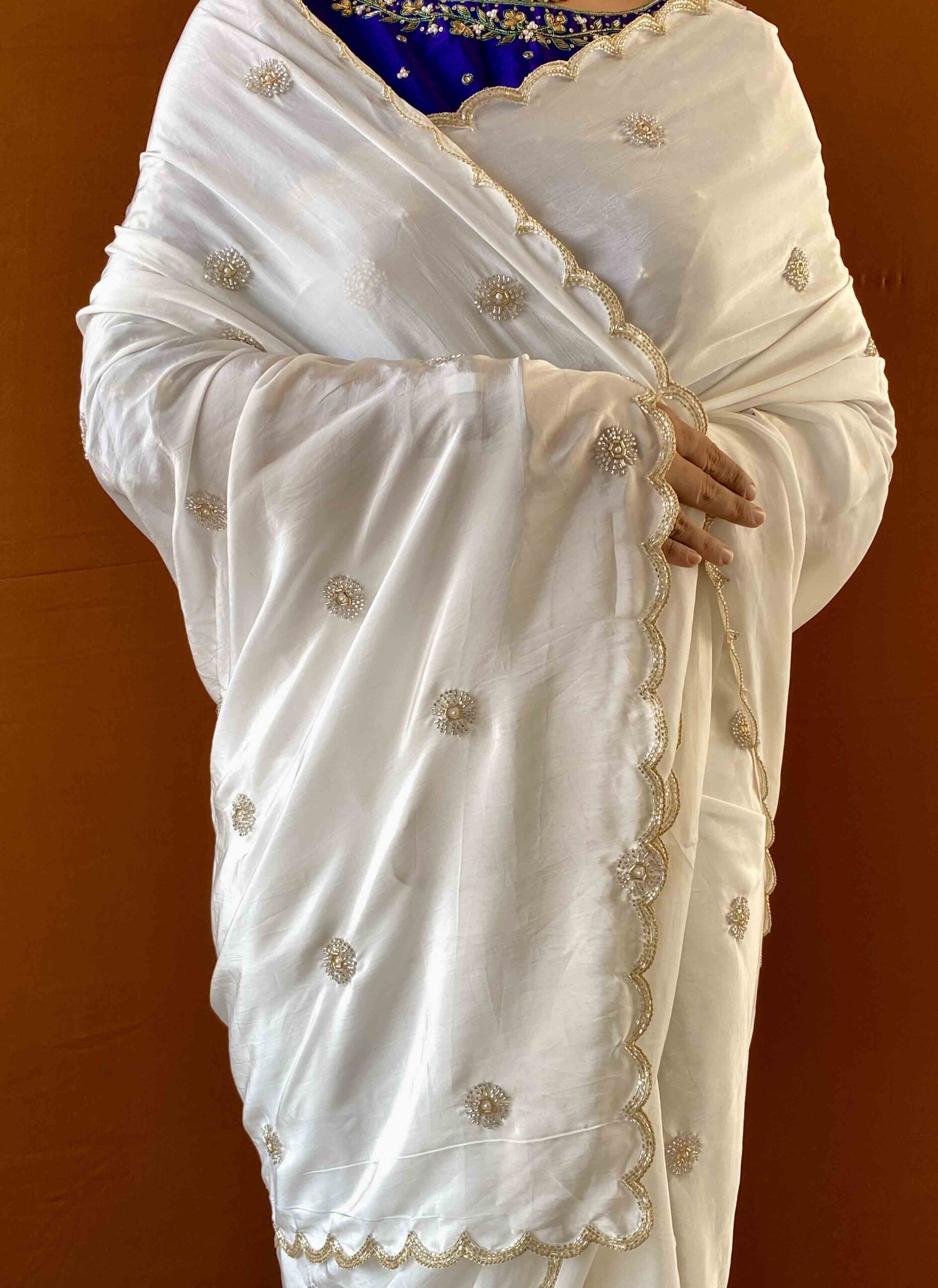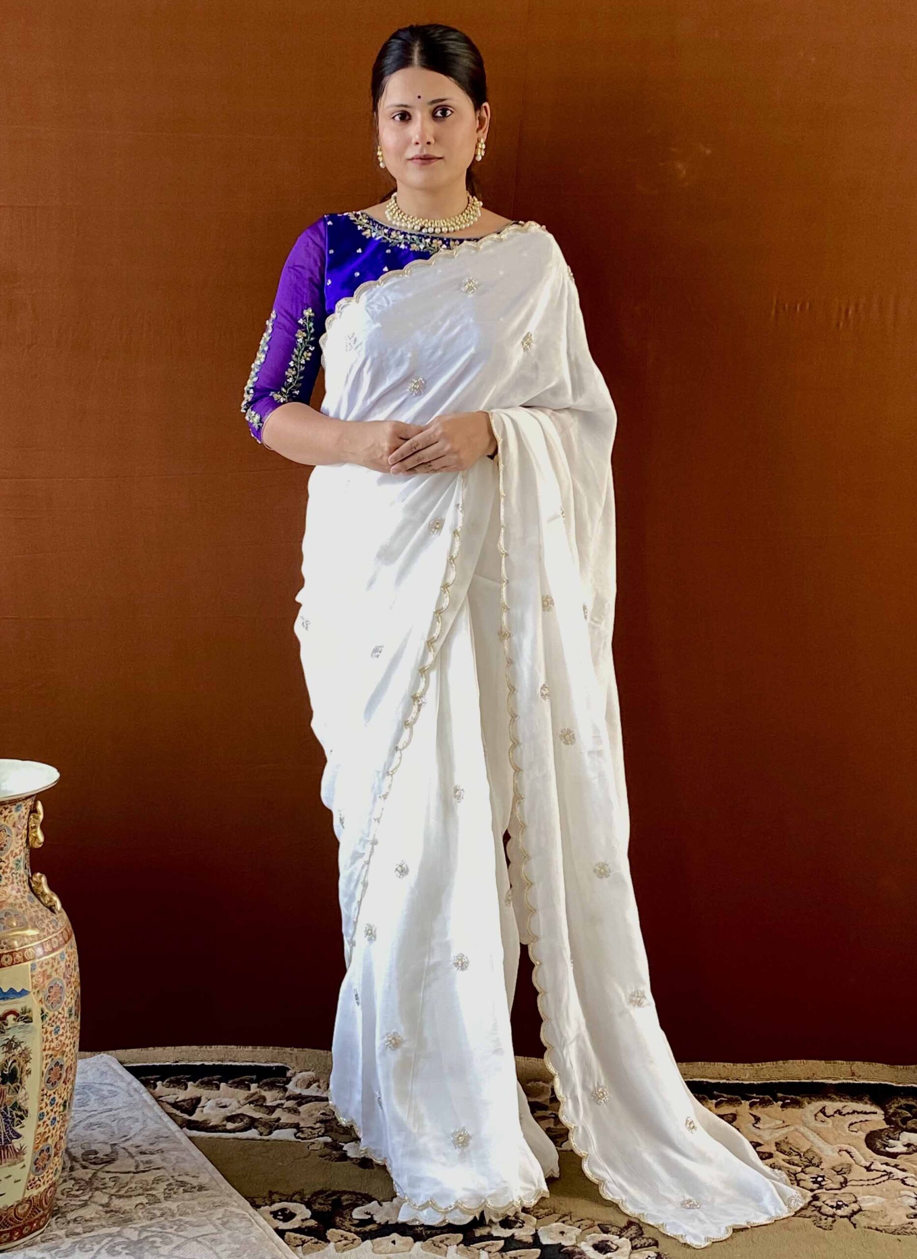 ruh white cutdana embroidered chinon crepe saree with blue handwork unstitched blouseRuh – White Cutdana Embroidered Chinon Crepe Saree with Blue Handwork Unstitched Blouse