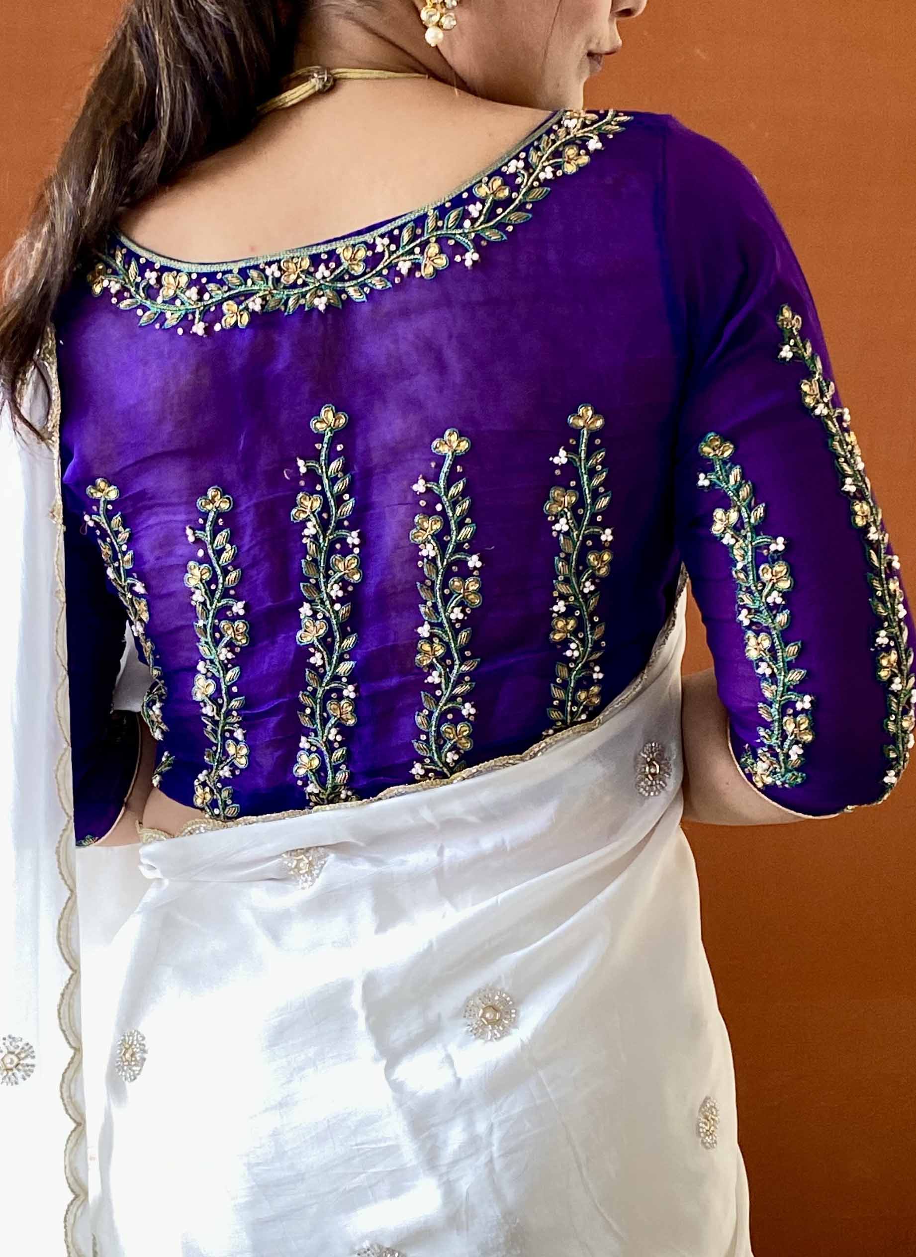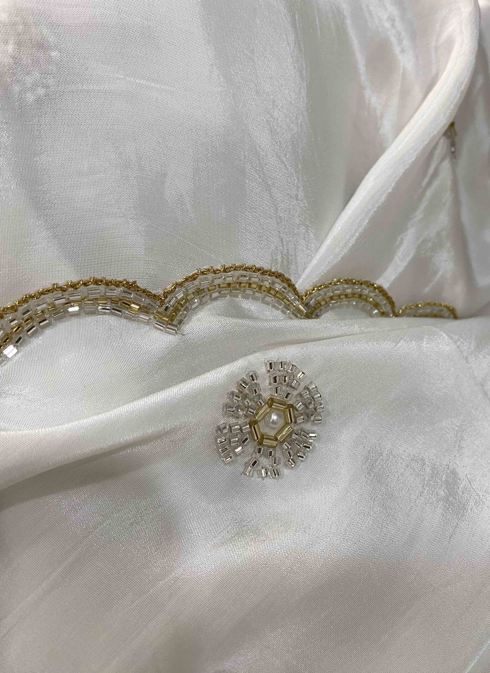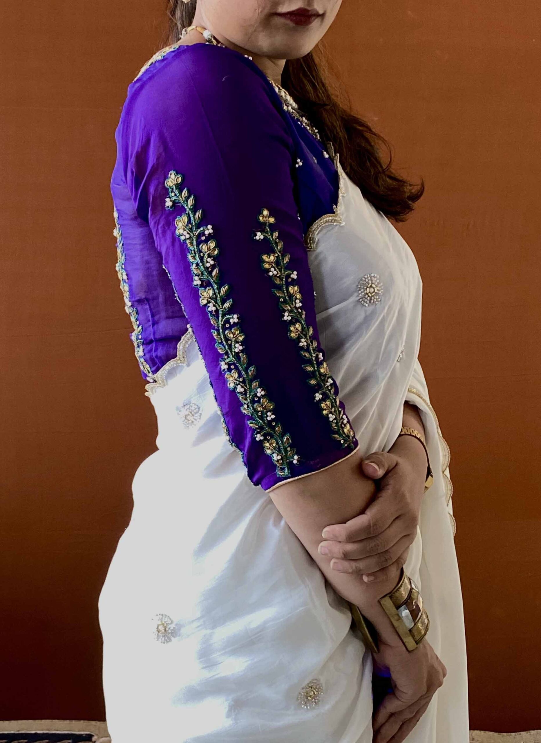ruh white cutdana embroidered chinon crepe saree with blue handwork unstitched blouseRuh – White Cutdana Embroidered Chinon Crepe Saree with Blue Handwork Unstitched Blouse