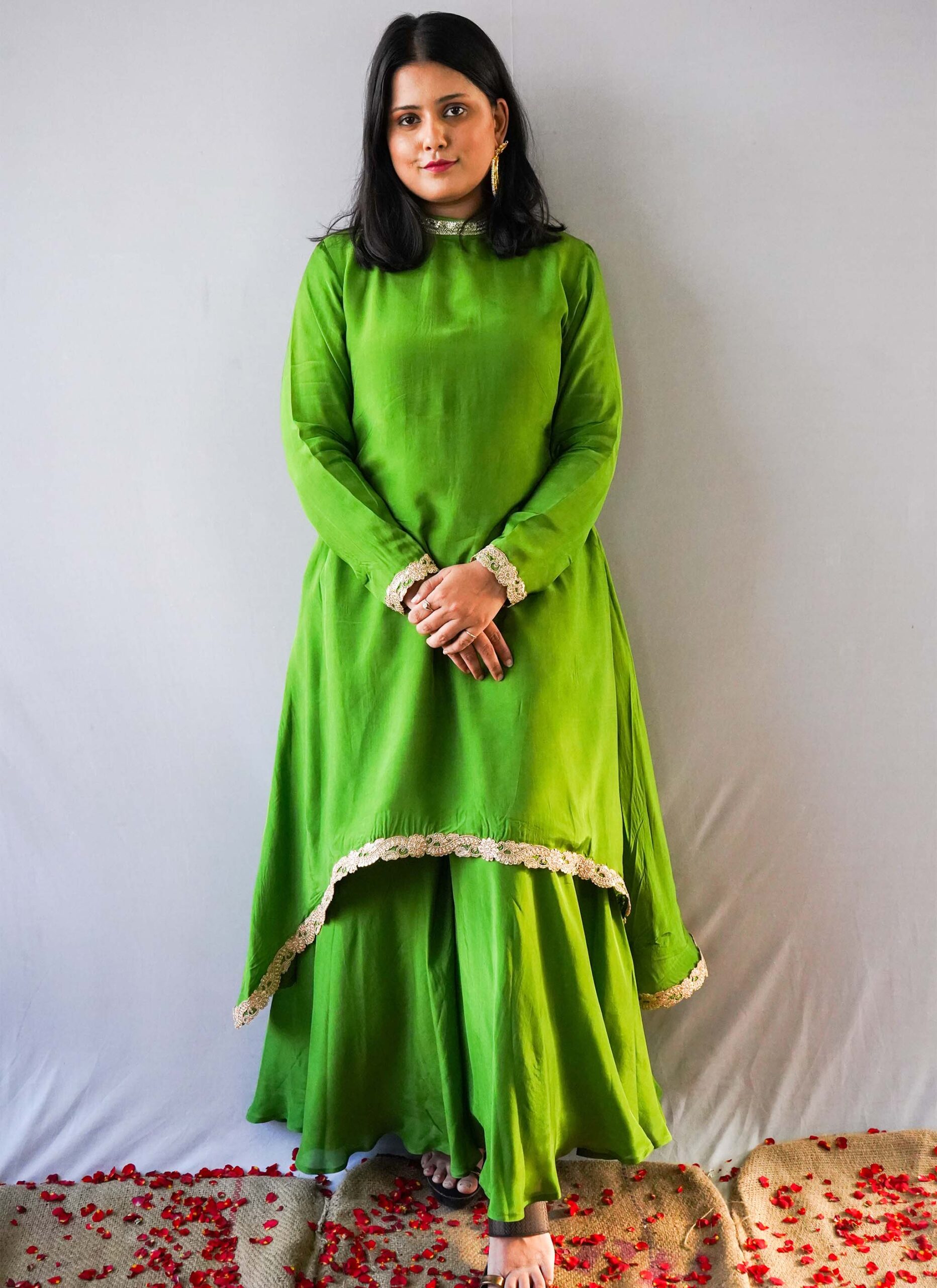 A women wearing Green China Crepe AntiSweat High-Low KurtiSaundarya – Green China Crepe High Low AntiSweat Kurti