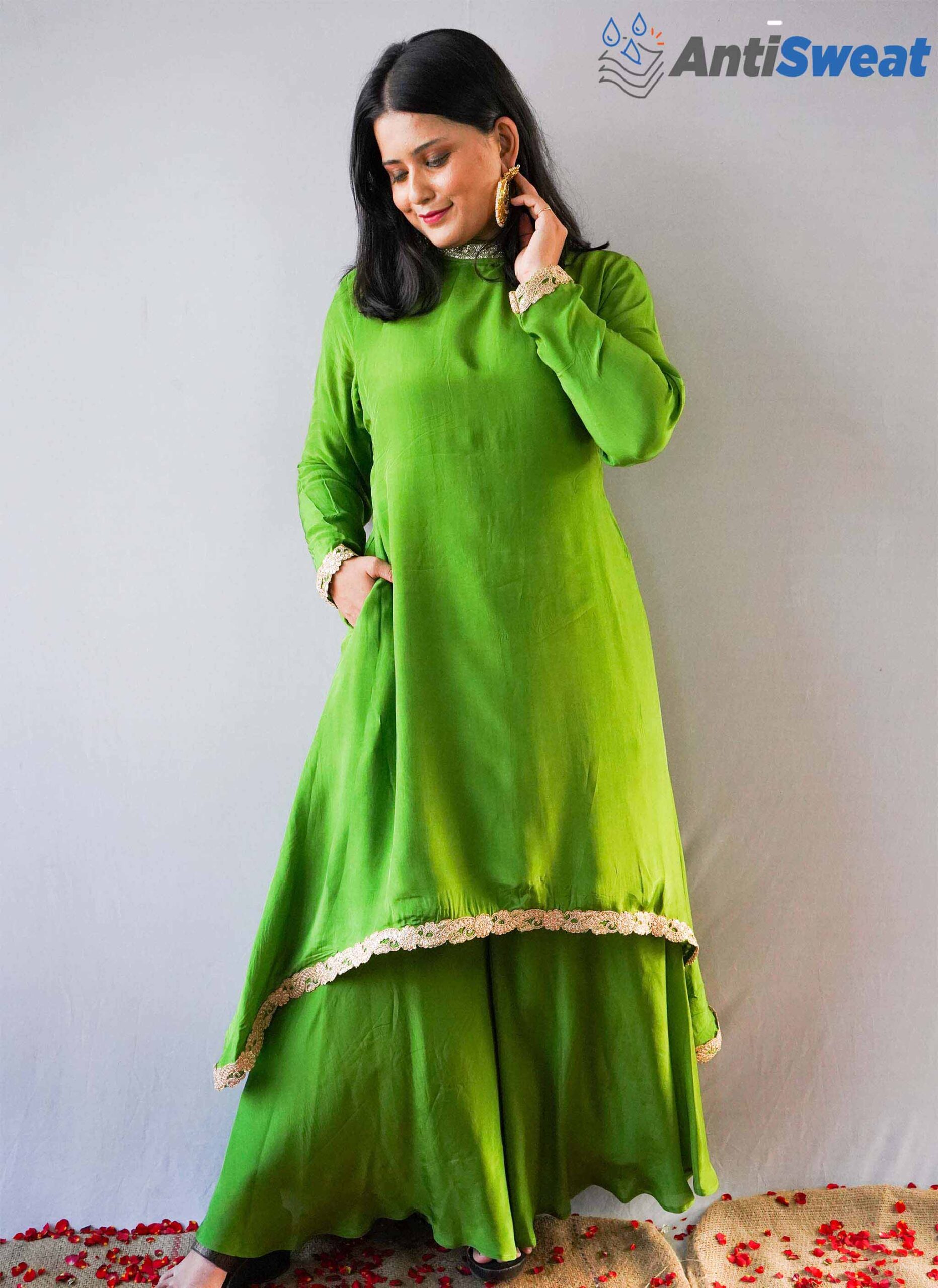 Saundarya – Green China Crepe High Low AntiSweat Kurti