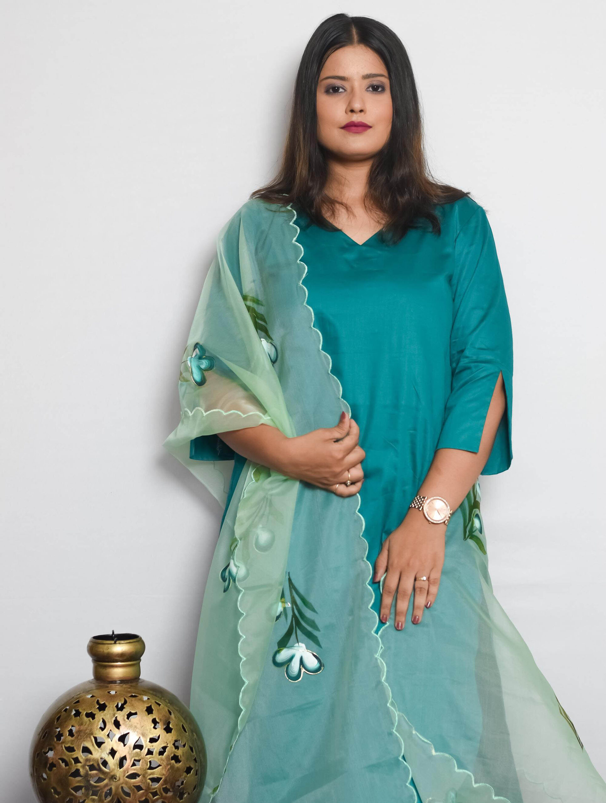 Vartika – Green Cotton Silk Kurti Set with Light Green Handpainted Dupatta
