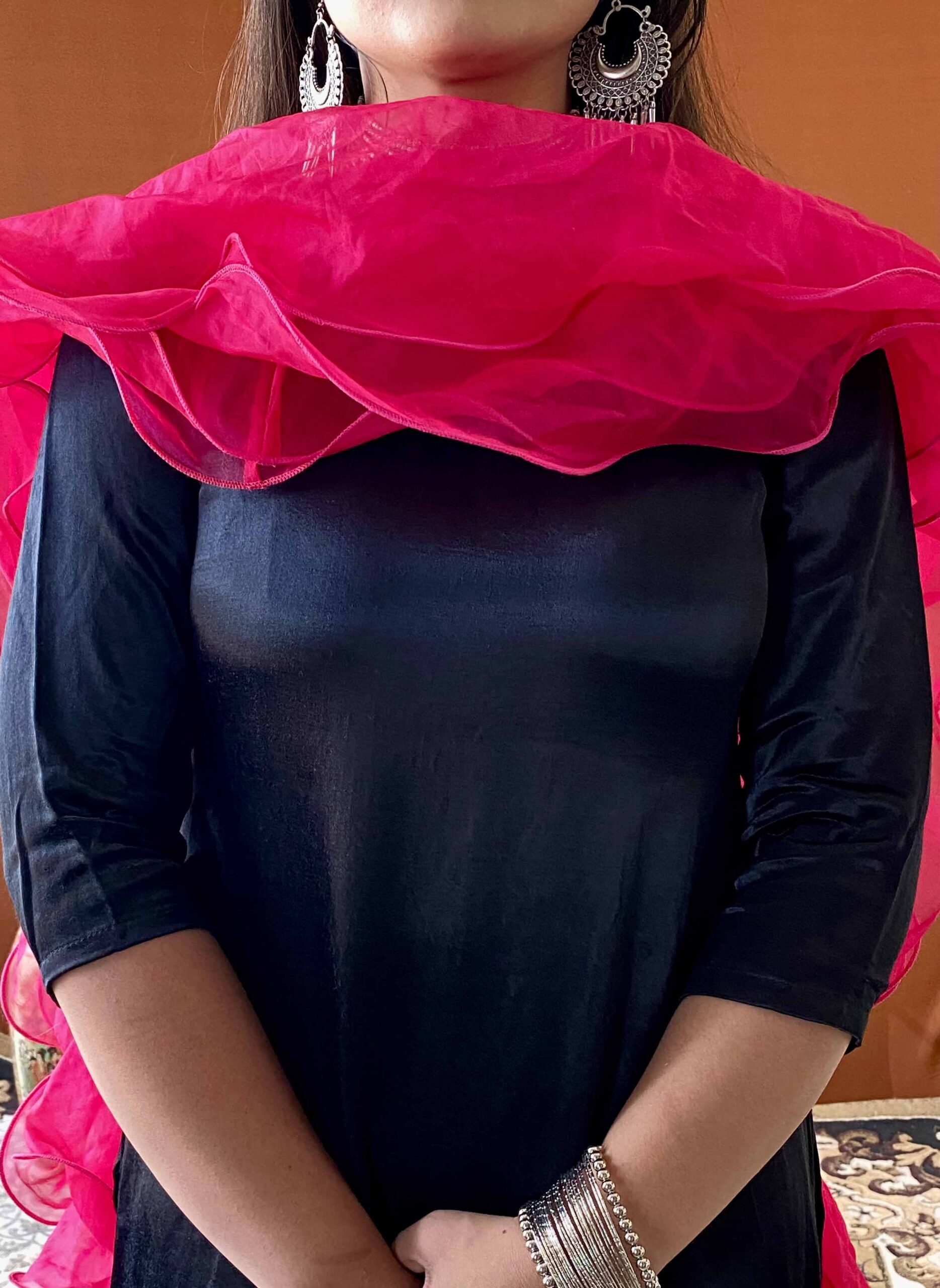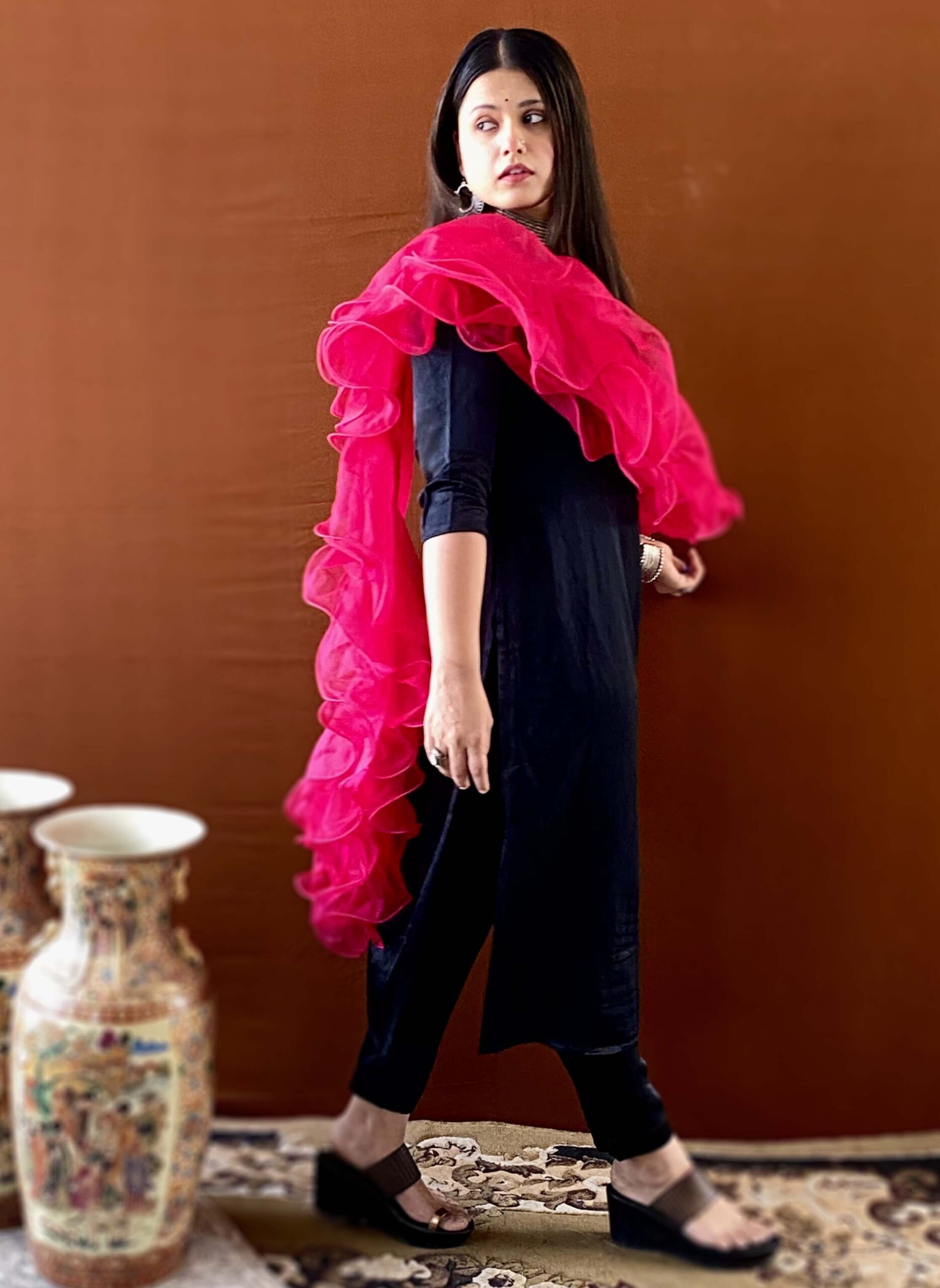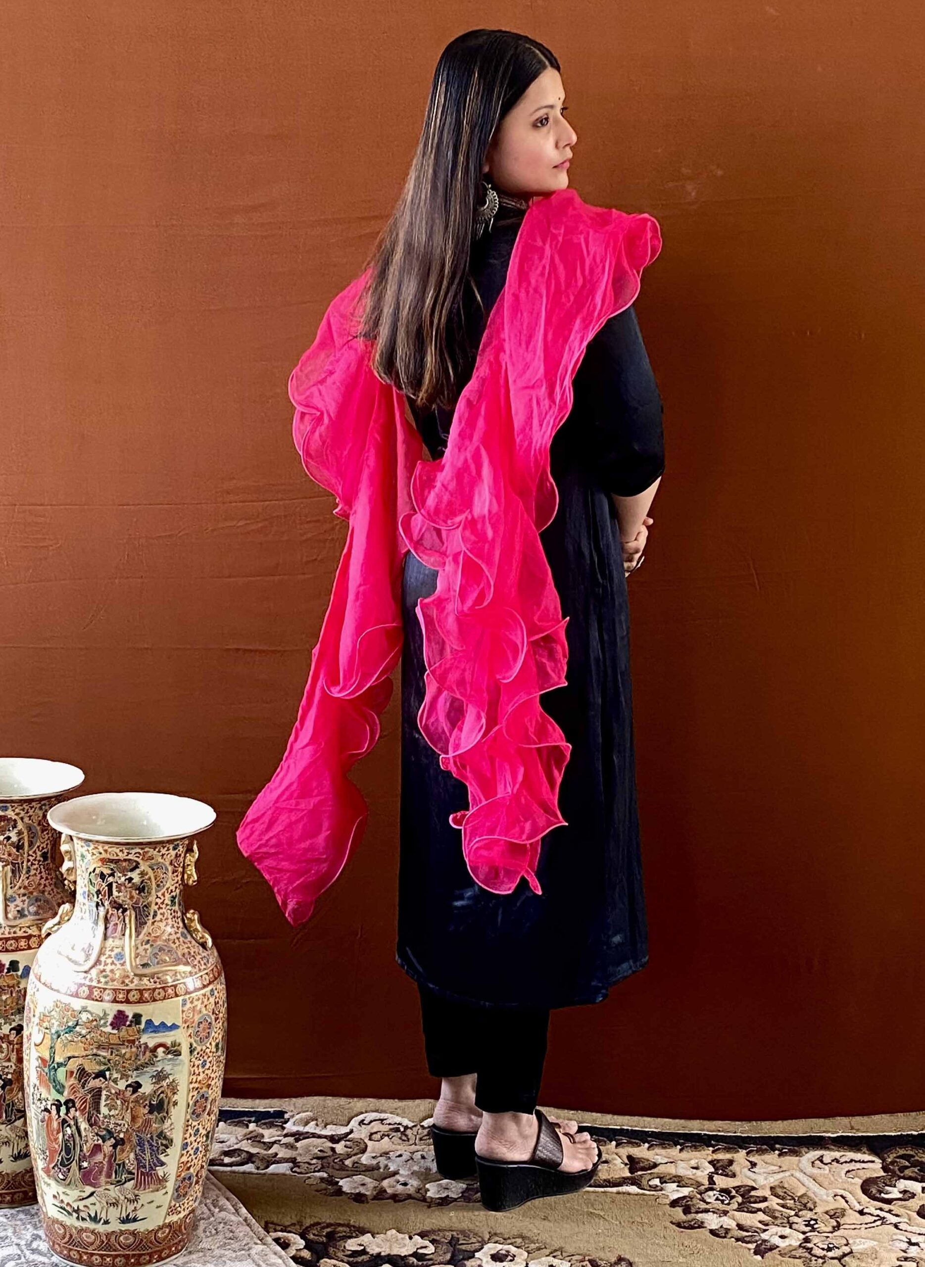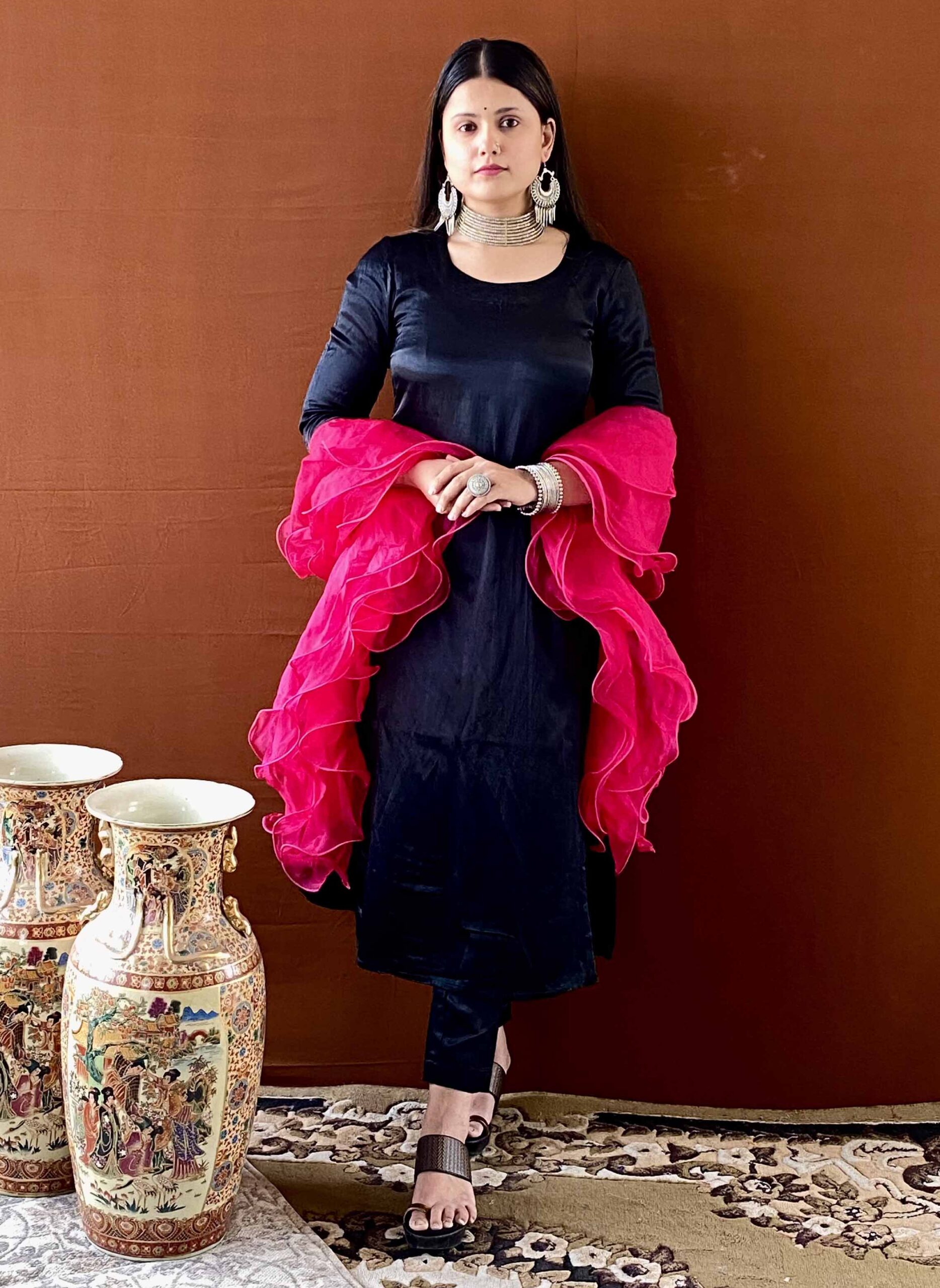 Ziva – Black Gaji Silk Kurti Set with Pink Ruffle Dupatta