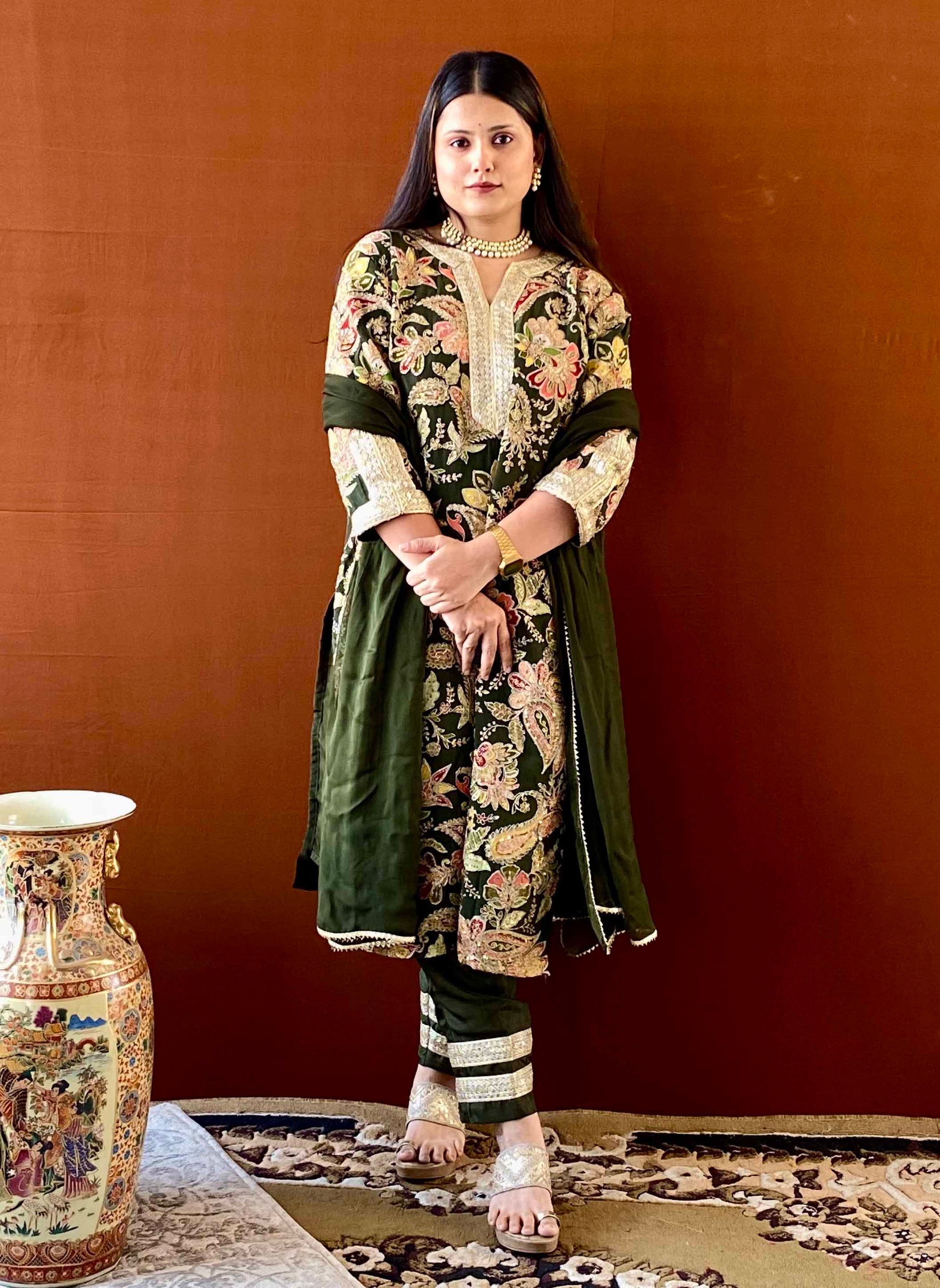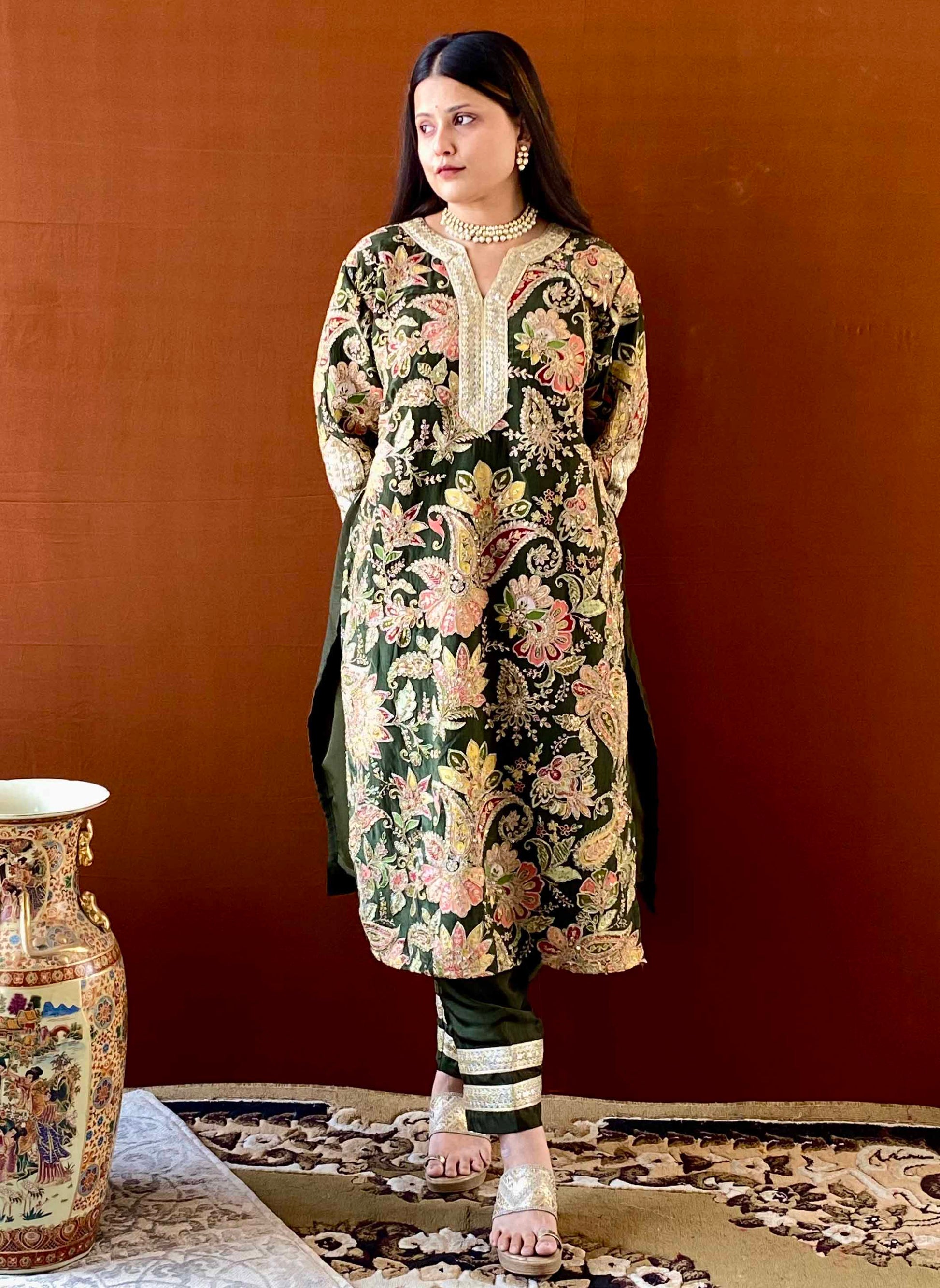 Step into timeless elegance with this green floral kurti set designed to elevate your look for any special occasion. Crafted in rich Upada silk, the kurti features delicate lace detailing on the neckline and sleeves, with a plain silk back and coordinated bottoms for comfort. Paired with a flowy green chiffon dupatta, this ensemble is the perfect blend of softness and sophistication. Ideal for festive gatherings, themed celebrations, and weddings where elegance is key.